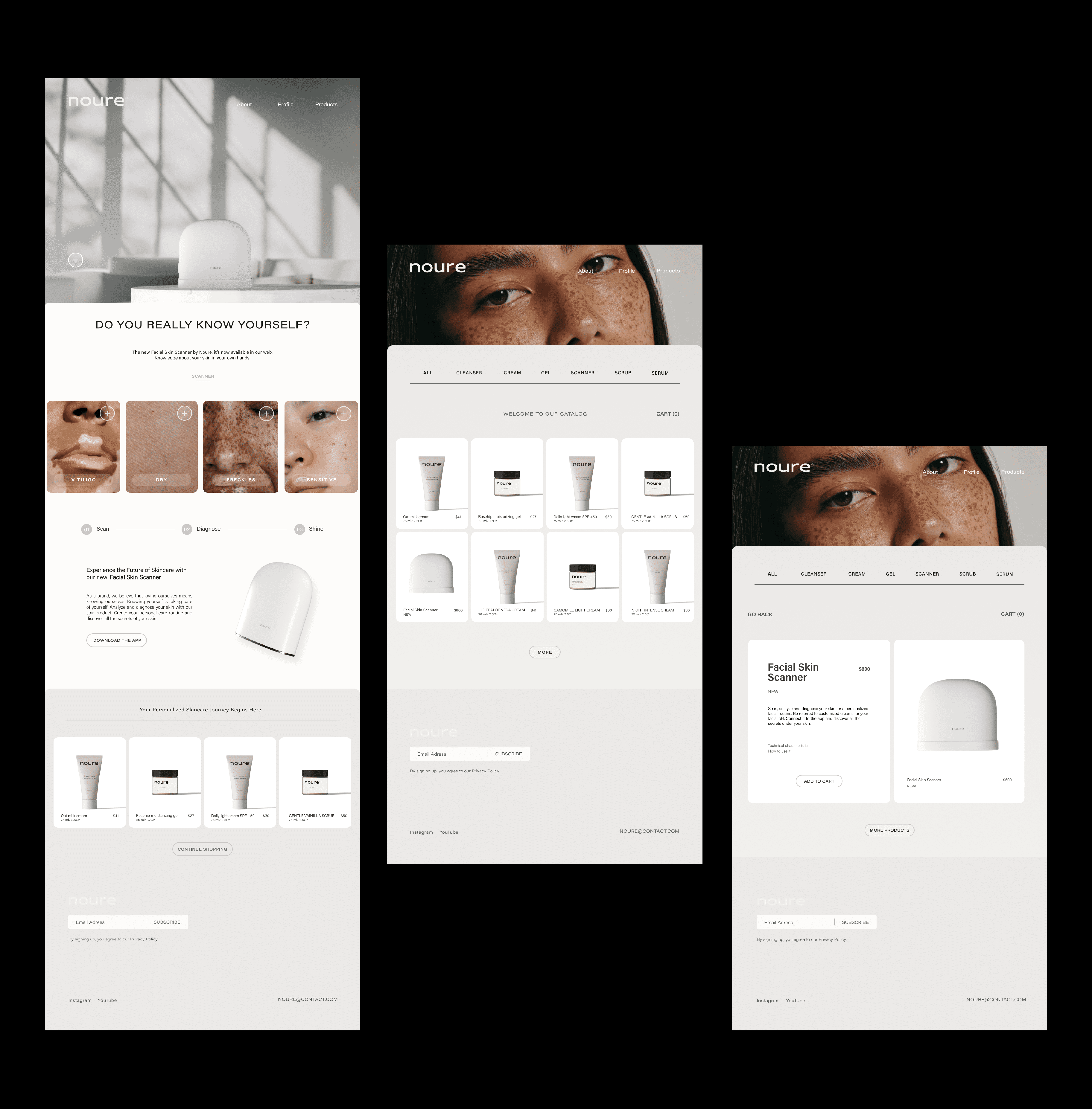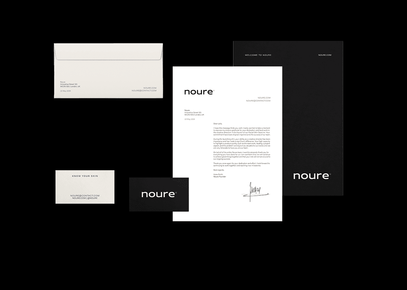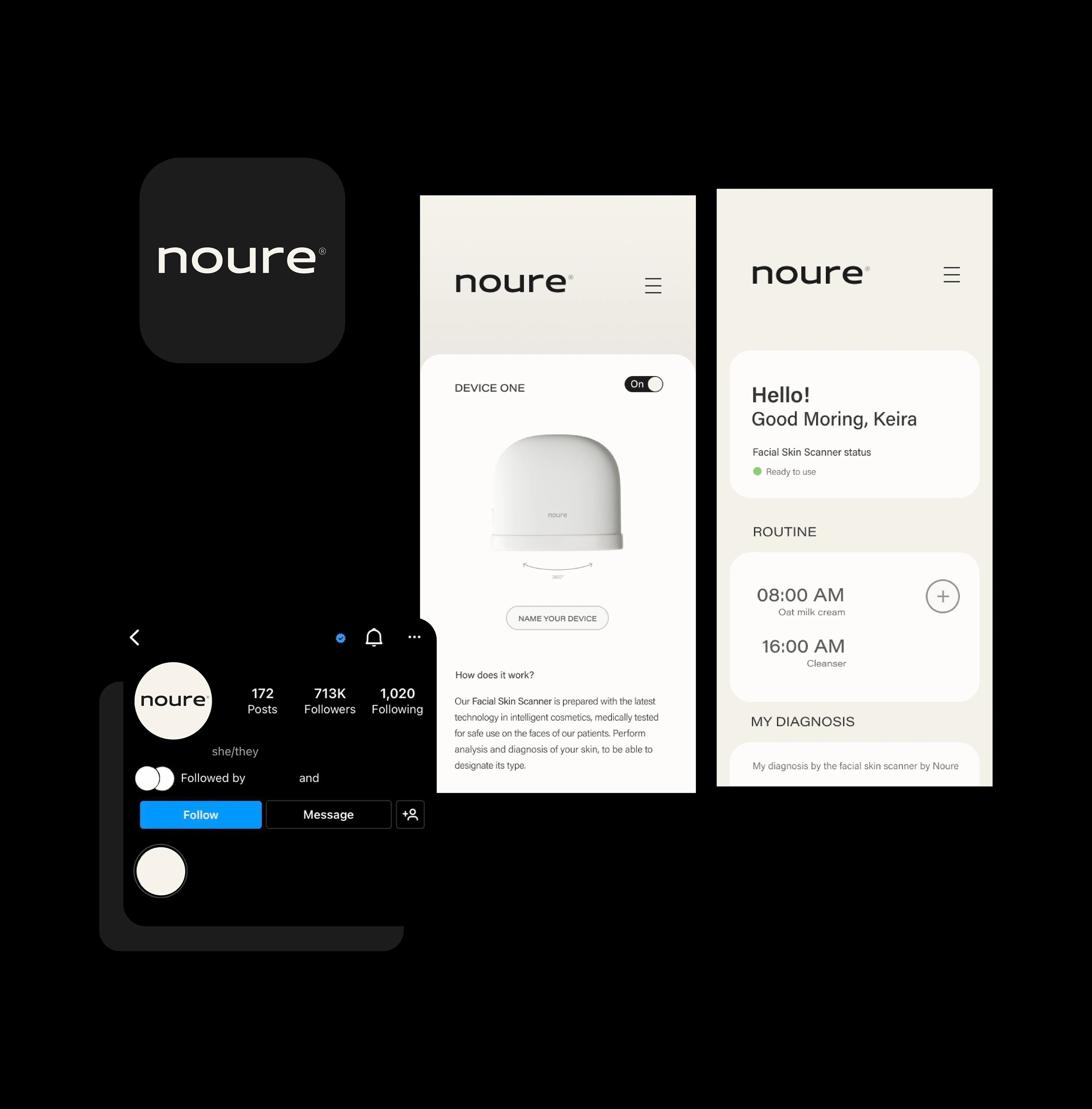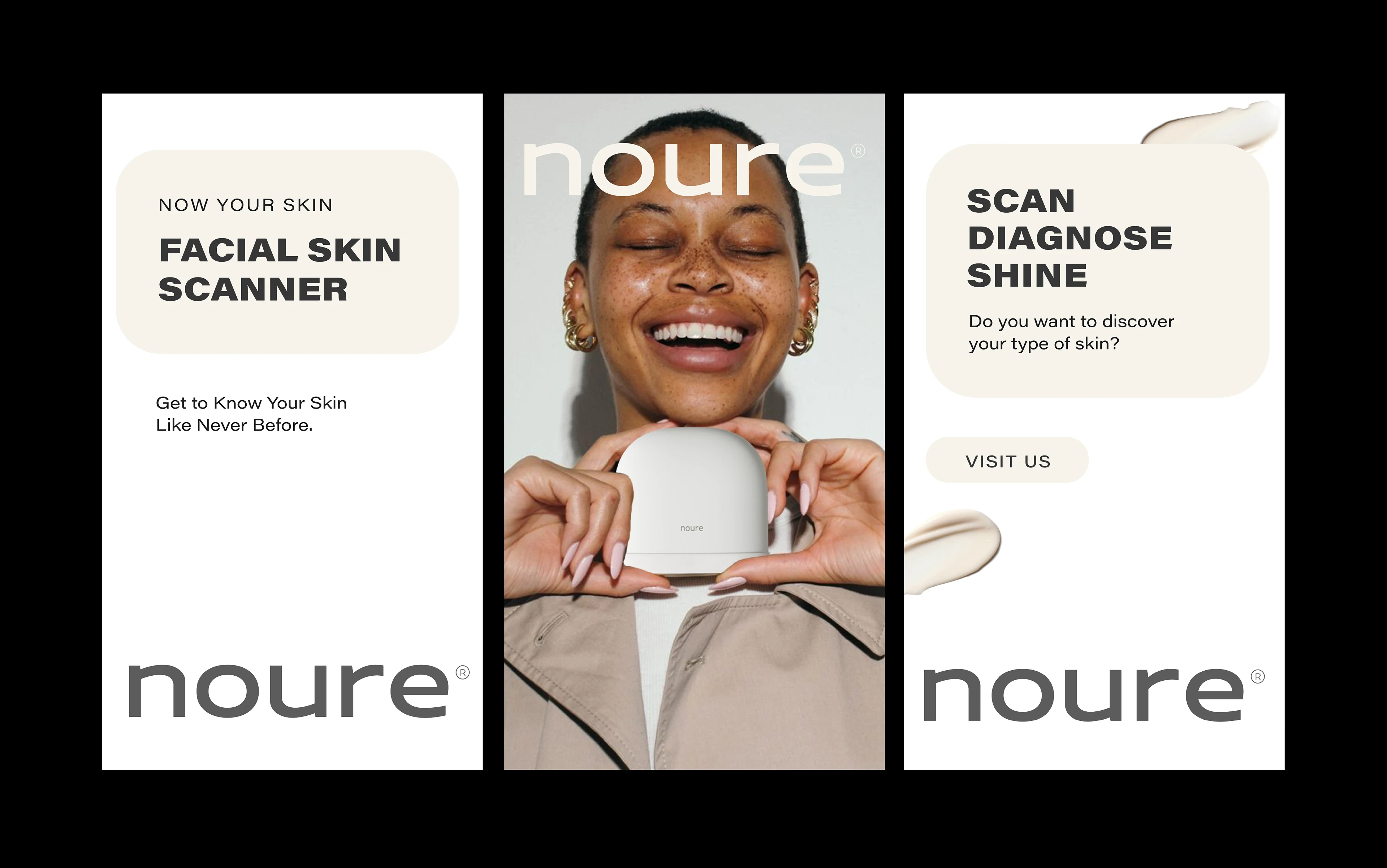 Noure is a young brand dedicated to aesthetic technology and comprehensive cosmetics. It was born by the concept of bringing facial health to the hands of customers, to the hands of the common human being. With the intention of making it something closer and not only in the hands of specialists. It is based on the idea of "Know your skin". It is our skin, we should know it in depth, take care of it and understand it before anyone else. Every human being is dierent, as every skin and each one has dierent needs. That is when Noure appears, the brand that looks forward to bring you closer to your own skin.This 360 project includes brand identity, typography, social media design, institutional stationery, outdoor signage, visual language, tone of voice, packaging, web design, merchandise, exterior facade, brand manual and guidelines.